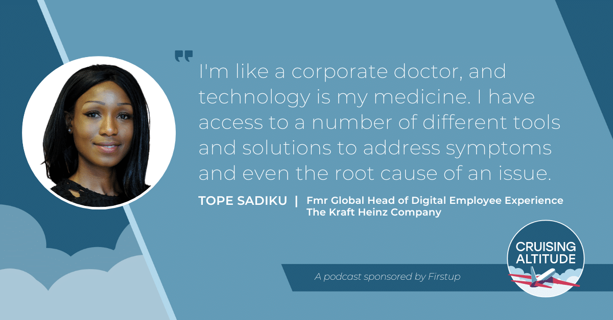 Tope Sadiku is the former Global Head of Digital Employee Experience at The Kraft Heinz Company, one of the largest food and beverage companies in the world with $25 billion in global sales. Tope has recently moved into her new role as the Strategic Planning Lead, Transformation, Agile and Digital Revolution at Kraft Heinz where her focus is to increase employee productivity and creativity through the use of technology. And on this episode, Tope is describing her work and research on how we move, achieve objectives, connect, and collaborate between physical and virtual spaces.