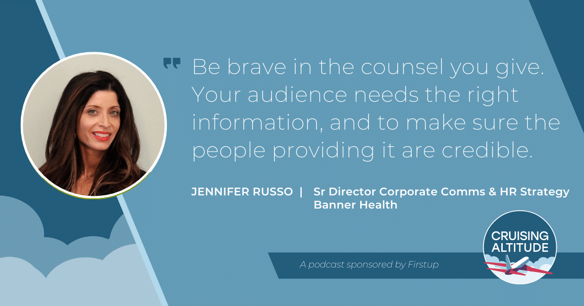 Jennifer Russo is the Senior Director of Corporate Communications and HR Strategy at Banner Health. Jennifer communicates on behalf of the Banner Health system to the 55,000 employees across six states. She also champions the strategy that makes Banner Health a great place to work. In this episode, she talks about communicating effectively during times of crisis, exploring different mediums like videos and podcasts, and offering mental health resources to employees.
