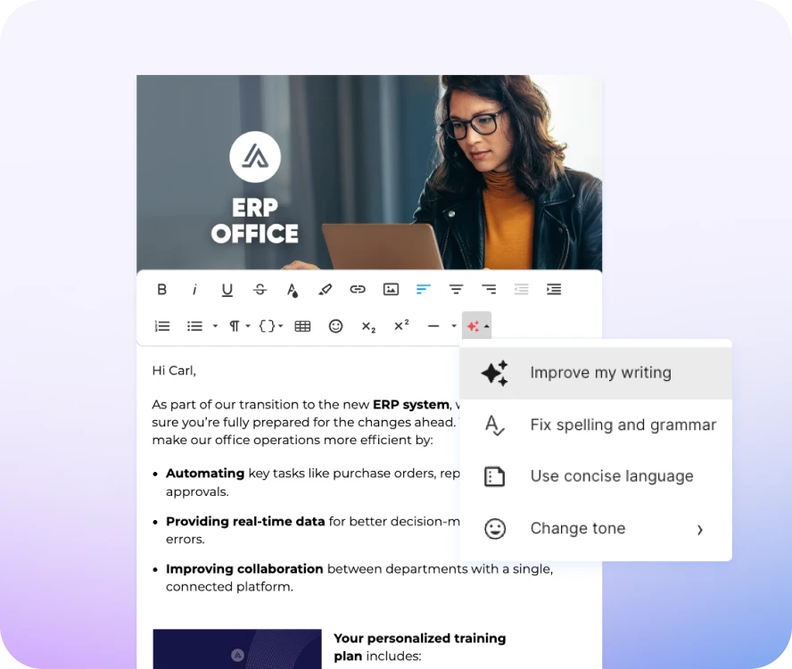 - Privacy and data protection: AI operates strictly within your enterprise security and data boundaries. We enforce real-time permissions, strong encryption, tenant isolation, and secure integrations by design. Customer data is never used to train external models and is retained only as necessary to deliver contracted services.